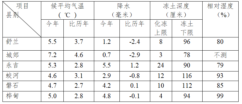 3月第6候(26-31日)气温明显偏高,降水稍少。平均气温为5.4℃,比历年同期高3.3℃;候降水量为3.2毫米,比历年同期少0.8毫米。各县市天气实况和冻土深度分布下: